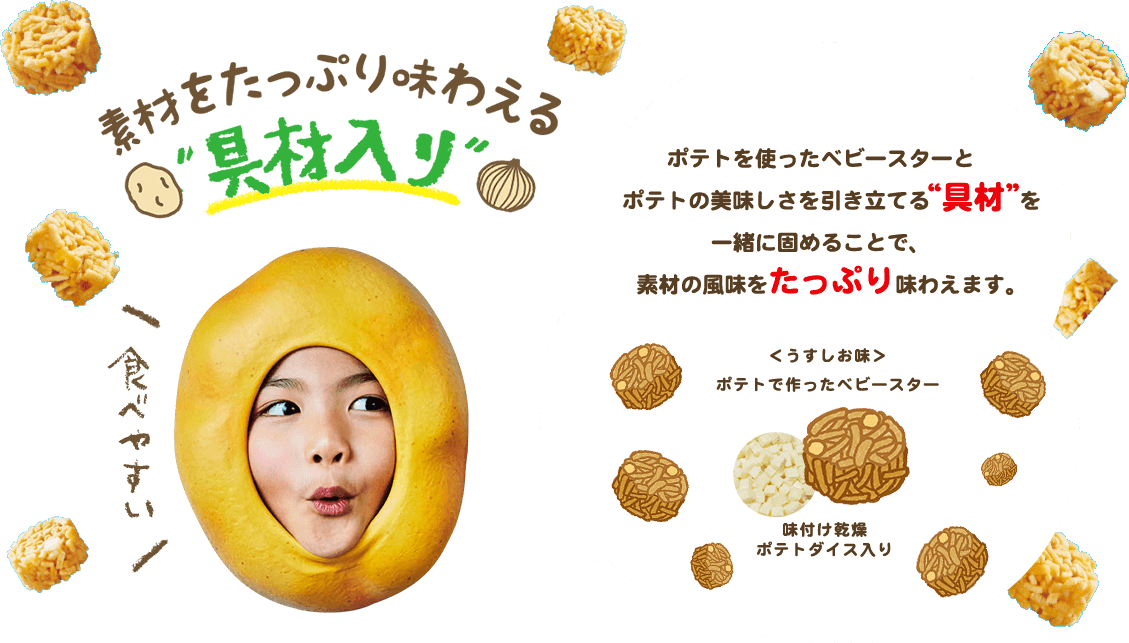 ポテトを使ったベビースターとポテトの美味しさを引き立てる“具材”を一緒に固めることで、素材の風味をたっぷり味わえます。