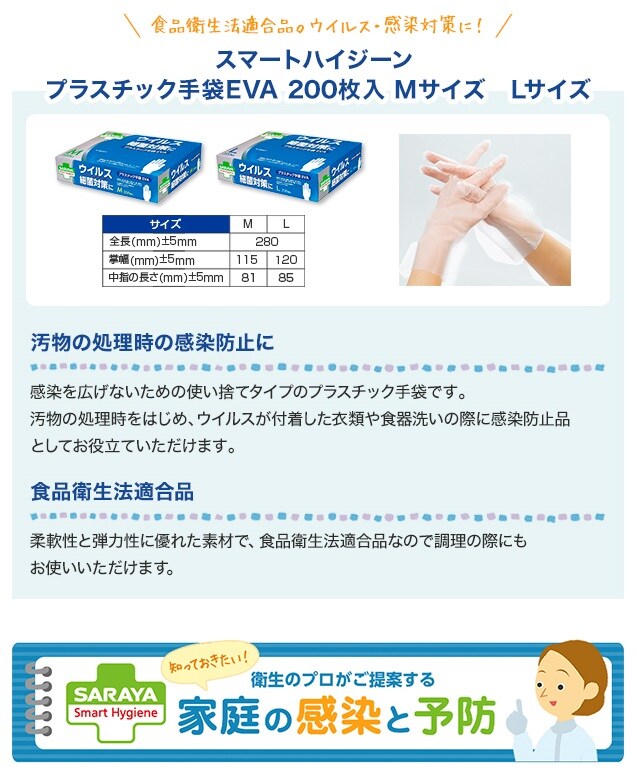 【スマートハイジーン プラスチック手袋EVA200枚入 M・L】http://family.saraya.com/products/smarthygine/index.html#glove