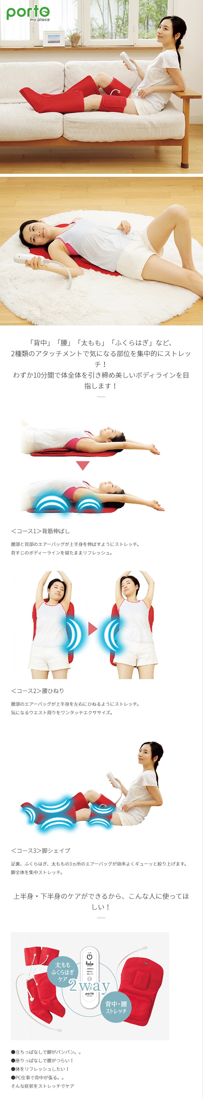 [レッド] ツカモトエイム/ポルト エアーストレッチ ピュアスリム/AIM-FN043|「背中」「腰」「太もも」「ふくらはぎ」など、2種類のアタッチメントで気になる部位を集中的にストレッチ!