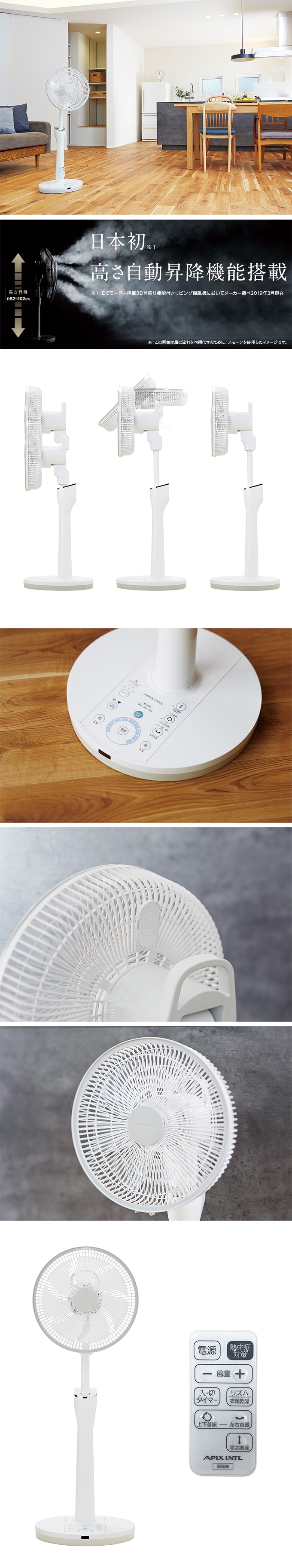 アピックス/DCリビング扇風機 30cm (高さ自動昇降機能搭載)|「扇風機の風が当たらない...」という悩み。スタンドパイプがゆっくりと自動昇降する構造システム搭載!キッチンで料理するお母さんに。