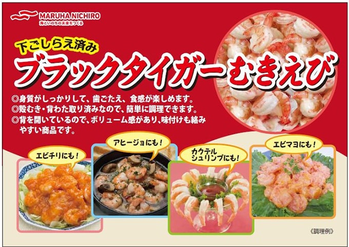 原材料:えび(ブラックタイガー、養殖)、食塩/pH調整剤、調味料(アミノ酸)、貝Ca