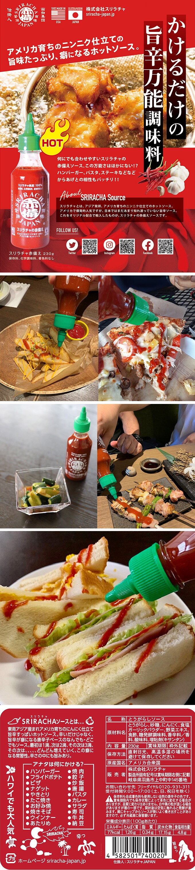 2013年初夏のアメリカにて。このソースがあらゆるレストランの卓上、アメニティ置き場に備えられており興味本位で食材にかけて口に入れたときの衝撃。素材の味はそのままで辛味と旨みが加わり食が進み一気に虜になってしまいました。このソースを日本でも販売したいと思い、研究開始。様々な壁が立ちはだかりましたがようやく保存料と酸化防止剤を使わず、天然の素材のみで構成した本商品が出来上がりました。マイルドな口当たりに旨みが広がるソースをいろんな食材にかけてお楽しみ頂けたら嬉しい限りです。この赤いソースを日本の食卓にも備えたいとの思いから「スリラチャの赤備え」と命名しました。