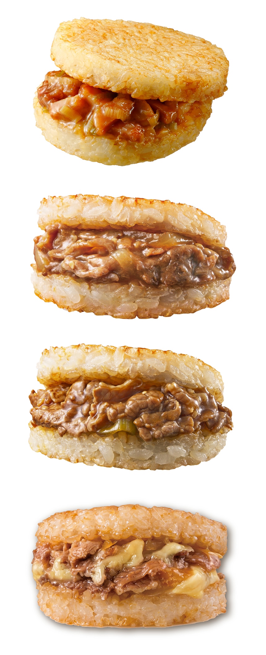 【ライスバーガーチーズ牛丼の味】うるち米(国産)、牛肉、玉ねぎ、醤油、プロセスチーズ、発酵調味料、植物油、砂糖、食塩、乳等を主要原料とする食品、おろしにんにく/増粘剤(加工でん粉)、調味料(アミノ酸)、香料、(一部に小麦・乳成分・牛肉・大豆を含む)
