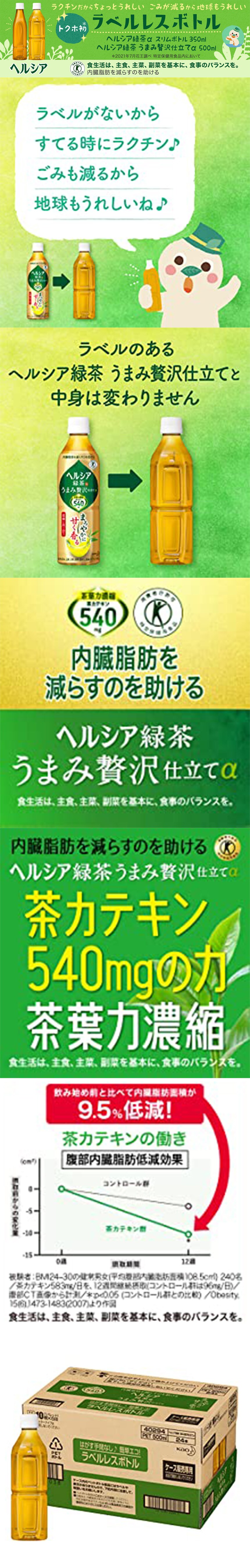 [24本]【特定保健用食品】花王 ヘルシア緑茶 うまみ贅沢仕立て ラベルレス 500ml | 茶カテキンの働きで、内臓脂肪を減らすのを助ける。環境に優しいラベルレスボトル。
