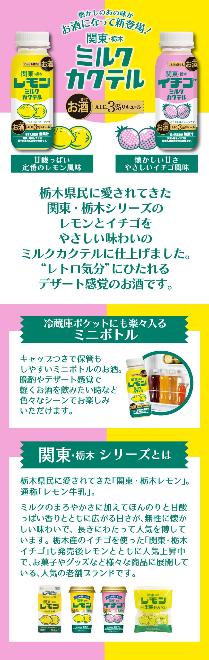 レモンミルクカクテル試して見ました。栃木のレモンミルクが好きでカクテルも好きなのでいいかと思ったのですが、とても美味しくいつものレモンミルクと同じ味でした。ただ、期限が短くて私一人では飲みきらず、知り合いにもお裾分けしたのですがそれでも残ってしまったです。お酒なので朝から飲んだり出先に持っていくわけもできず。ただ、味は美味しいので店頭に売ってたら1つ購入する分にはいいと思います。