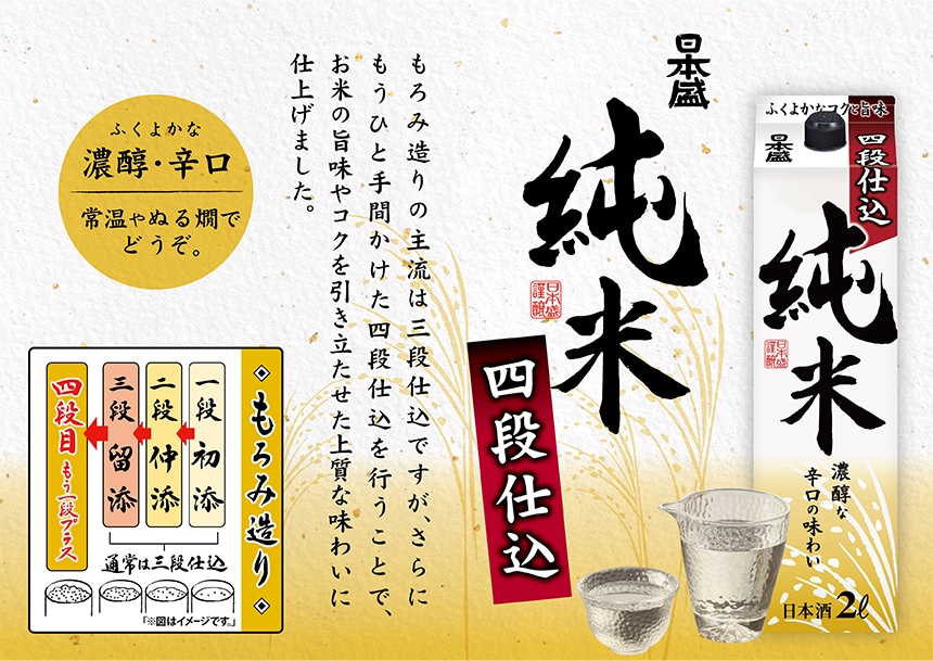 日本酒の醸造工程の一つである醪造りにおいて、麹と蒸米を三段階(初添→仲添→留添)に分けて仕込む三段仕込に、もう一段階仕込むことで米の旨味とコクを引き立てた上質な味わいに仕上げました。適度な酸味が醸し出すふくらみのある味わいと後味がすっきりしたキレの良さが特長です。