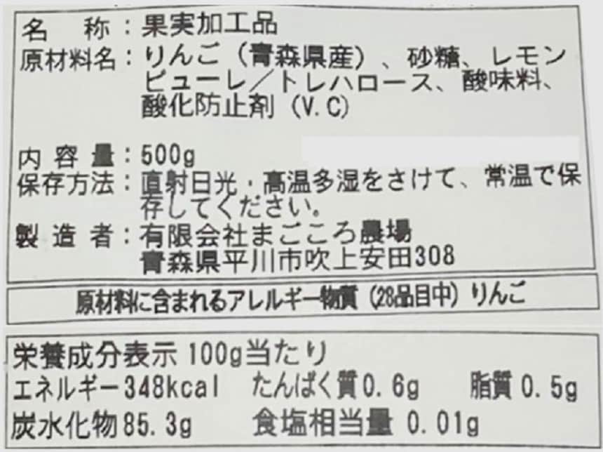 アレルギー表示:りんごを含む。(本商品製造工場では、小麦、卵、乳、アーモンド、オレンジ、牛肉、くるみ、鶏肉、豚肉、もも、ゼラチンを含む製品を製造しております。)