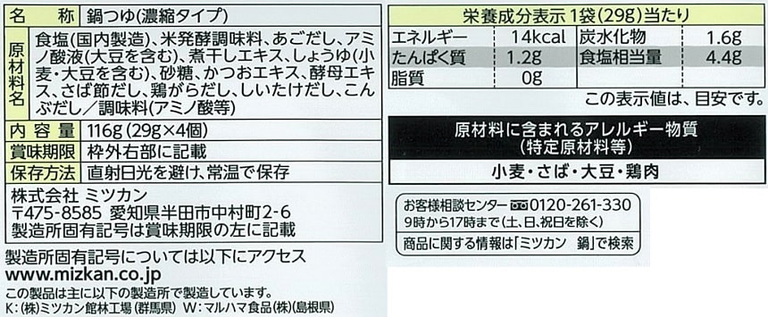 - ミツカン こなべっち 焼あごだし鍋つゆ 116g(29g×4袋入)
