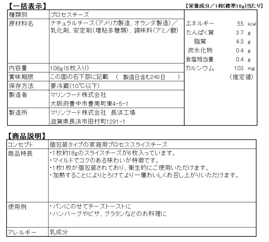 ・1枚約18gのスライスチーズが6枚入っています。
