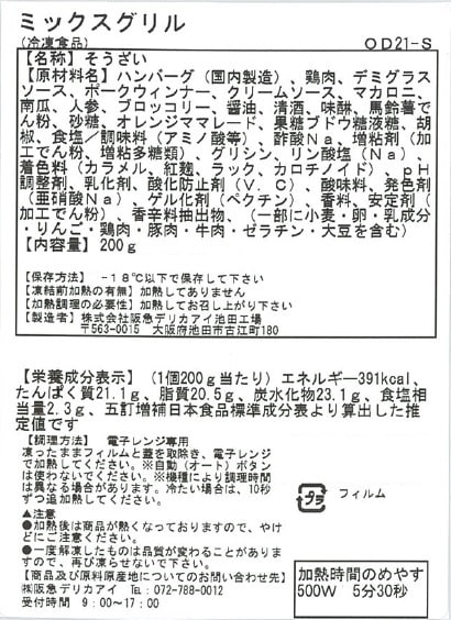 【ミックスグリル】小麦・卵・乳成分・りんご・鶏肉・豚肉・牛肉・ゼラチン・大豆