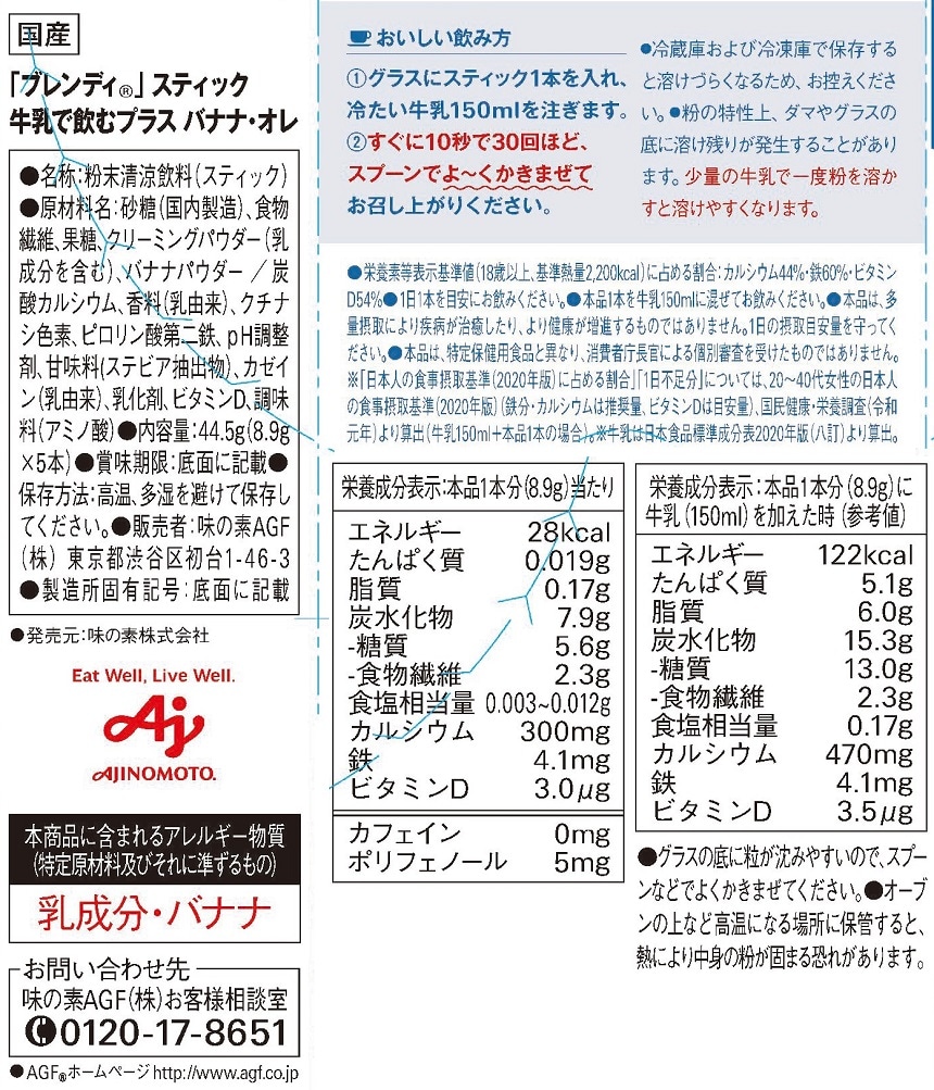 - 「ブレンディⓇ」スティック牛乳で飲むプラス バナナ・オレ 8.9g×5本入