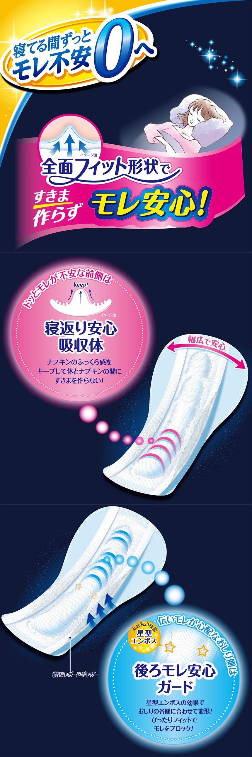 ●ドッとモレが不安な前側は「寝返り安心吸収体」。ナプキンのふっくら感をキープして、体とナプキンの間にすきまを作らない。