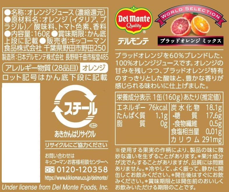 - ・デルモンテ WORLD SELECTION ブラッドオレンジミックス 160g×20本(賞味期限:2023/12/25)