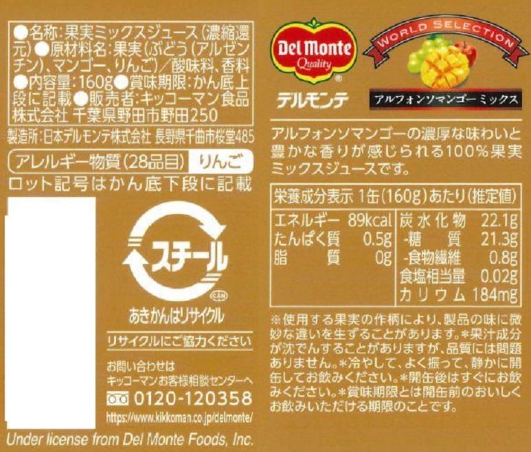 ・デルモンテ WORLD SELECTION アルフォンソマンゴーミックス 160g×20本(賞味期限:2024/05/03)