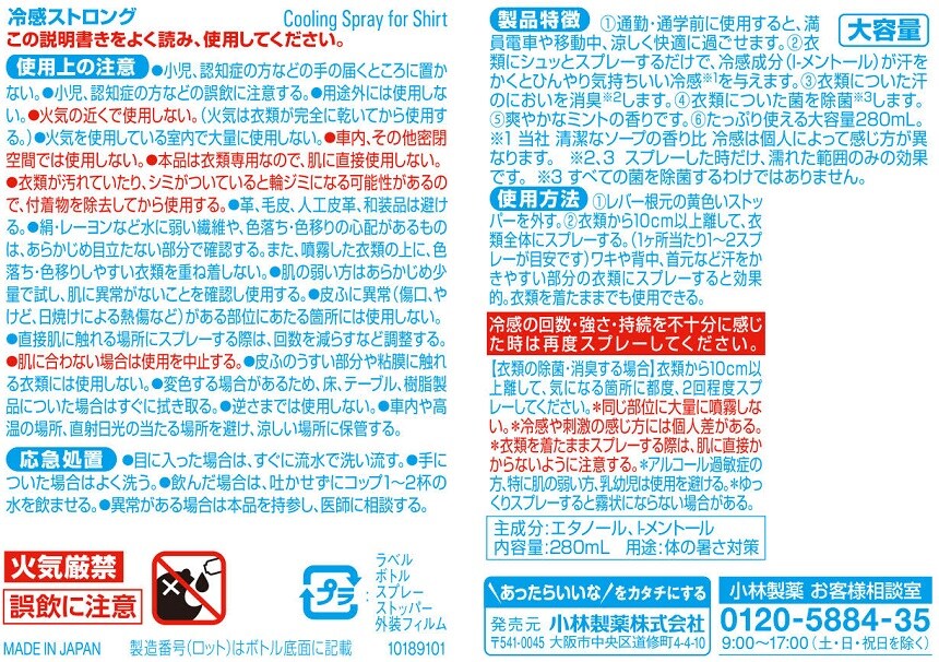 [22個]小林製薬 熱中対策 シャツクール 冷感ストロング 280mL | 衣類にスプレーするだけ汗をかくとひんやり※※冷感は個人によって感じ方が異なります。