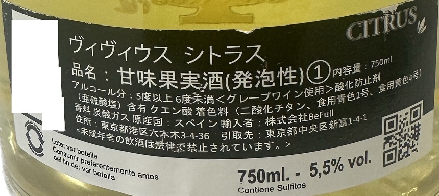 原材料:グレープワイン、酸化防止剤(亜流酸塩含有)、クエン酸、着色料(二酸化チタン、食用青色1号、食用黄色4号)