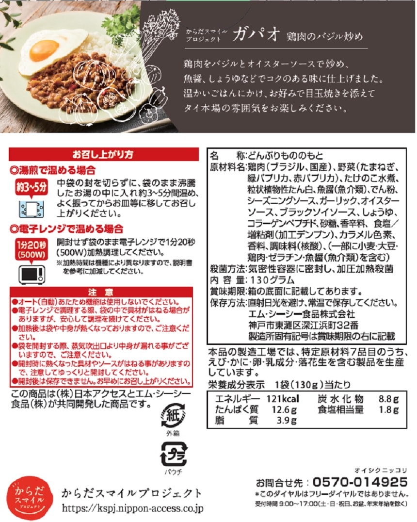 [20食]日本アクセス からだスマイルプロジェクト ガパオ鶏肉のバジル炒め 130g | バジル、オイスターソース、魚醤、しょうゆなどでコクのある味