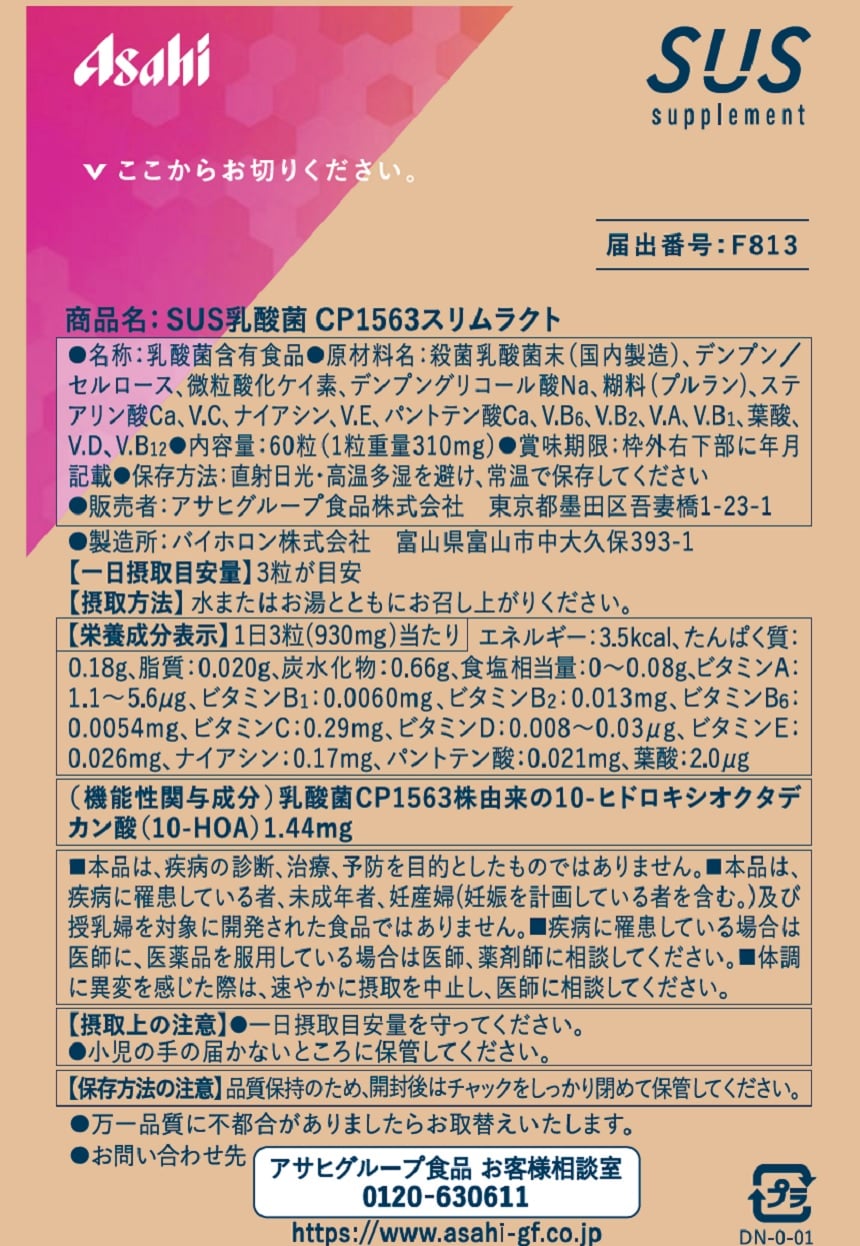 [4個]【機能性表示食品】アサヒグループ食品 SUS乳酸菌CP1563スリムラクト 60粒 | 肥満気味の方に向けて、ニーズの高い「おなかの脂肪(体脂肪・内臓脂肪)を減らすのを助ける」商品をご提案