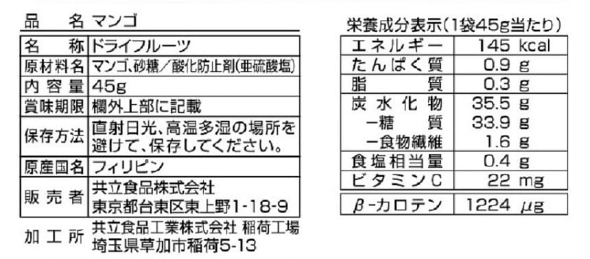 [10個]共立食品 マンゴ チャック付 45g | 香りと味の強いフィリピン産カラバオ種マンゴを使用。β-カロテンとビタミンCをたっぷり含んだ香りの強いドライフルーツ