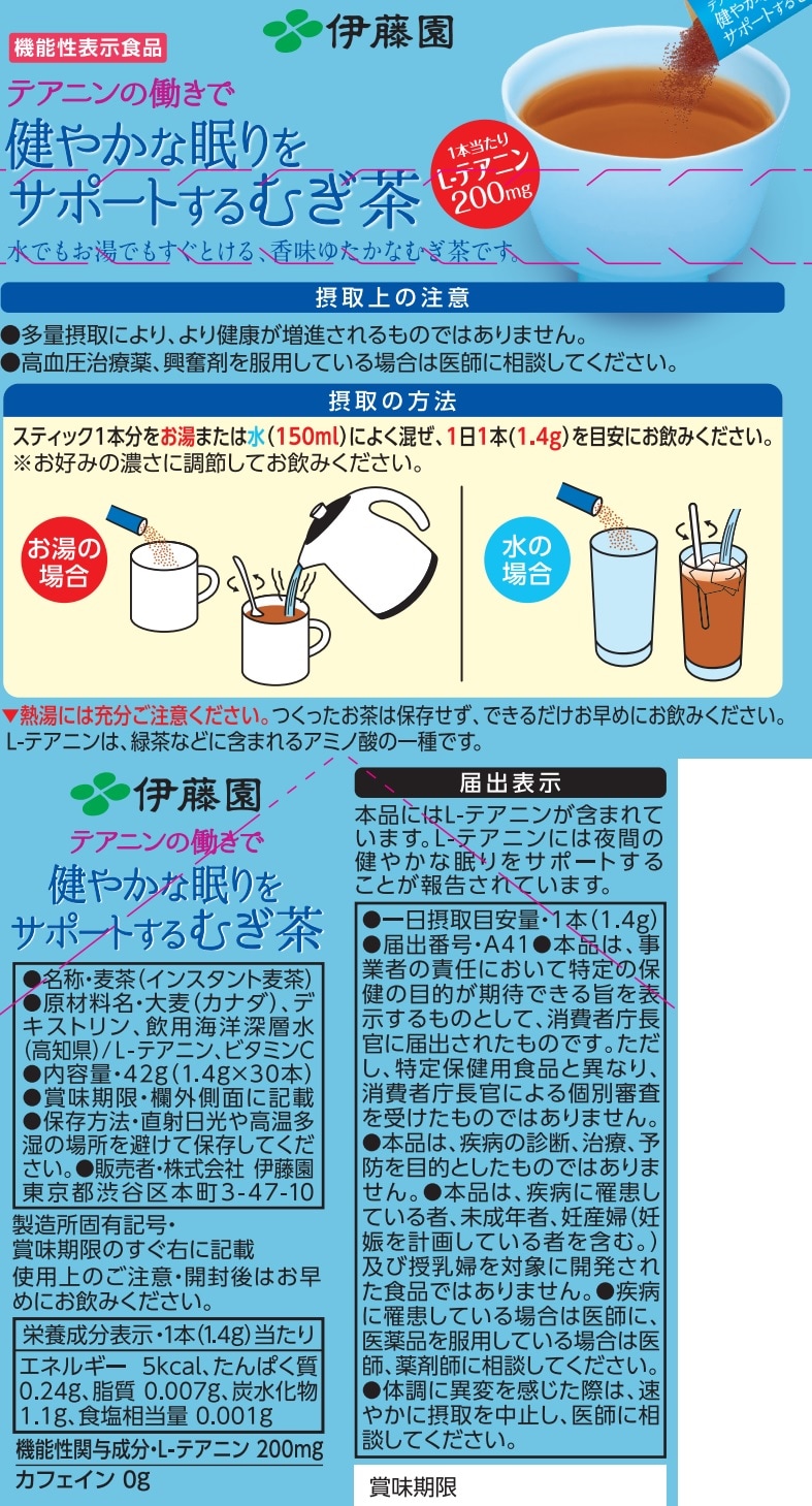 [3箱]【機能性表示食品】伊藤園 テアニンの働きで健やかな眠りをサポートするむぎ茶 1.4g×30本 | テアニンの働きで健やかな眠りをサポートするむぎ茶です。