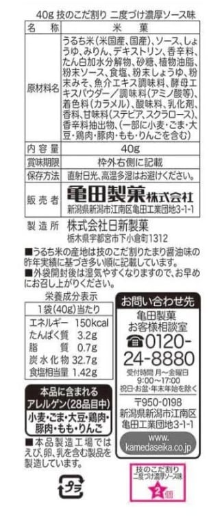[30袋]亀田製菓 技のこだ割り二度づけ濃厚ソース味 40g | 唐辛禁断のソース二度づけで濃厚な味わいに仕上げた「技のこだ割り 二度づけ濃厚ソース味」