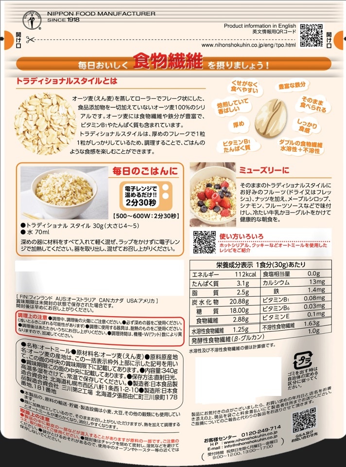 - 日食 プレミアム ピュア トラディショナル オートミール 340g×5個
