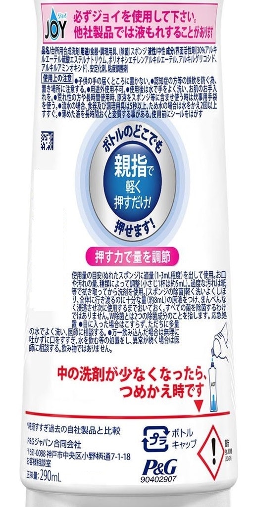 - ジョイ W除菌 食器用洗剤 逆さボトル さわやか微香 本体 290ml
