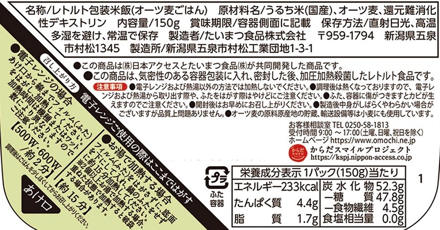 - ・からだスマイルプロジェクト オーツ麦ごはん 150g×3個