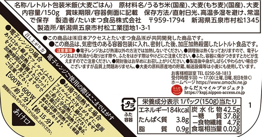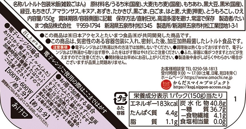 国産米(うるち米)100%使用です。家族の食卓にも、お一人での食事にも。一食分でも、一品だけでも。いつもの食事にささっと「からだスマイルプロジェクト」をプラスして、手軽に栄養バランスを整え、健康的で美味しい食生活を楽しめます。