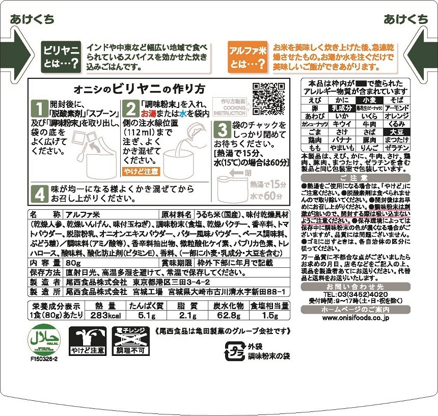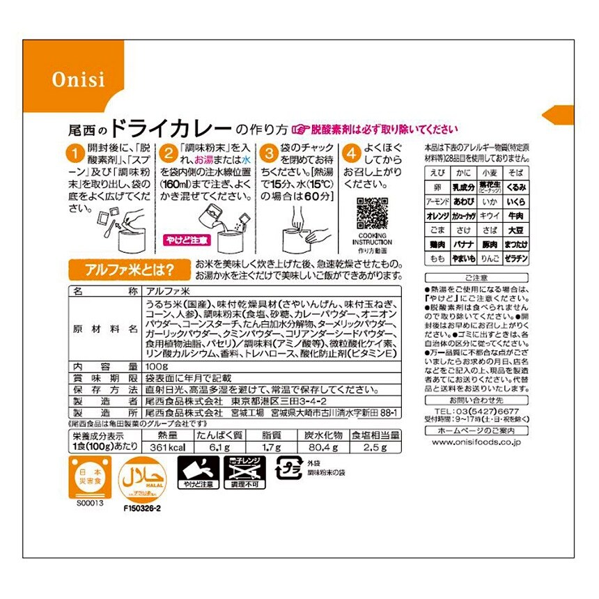 「尾西のアルファ米ドライカレー(アレルギー対応品)」は4種の野菜とスパイスのさわやかな香り。