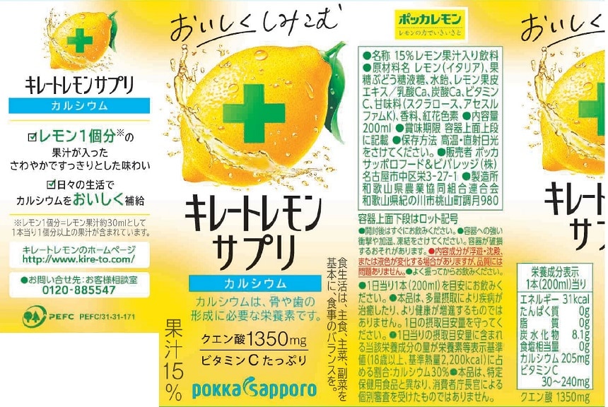 レモン1個分の果汁※、クエン酸1350mg、カルシウム205mg、ビタミンCがたっぷり入った「栄養機能食品(カルシウム)のレモン飲料」です。