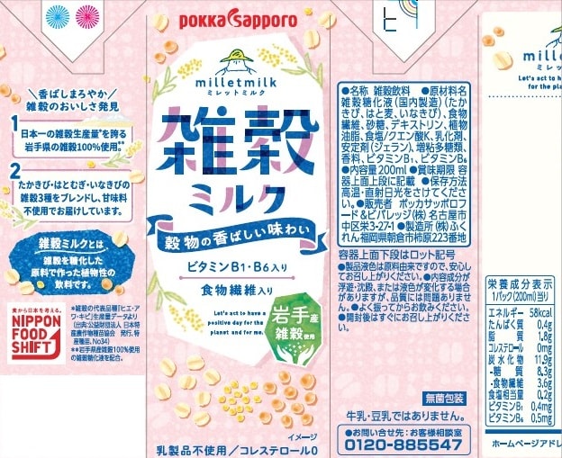 岩手県産の雑穀3種をブレンドし、穀物の香ばしさを活かしながら、すっきりした甘さで飲みやすく仕上げた、雑穀ミルク~milletmilk~です。食物繊維・ビタミンB1&B6を、美味しく手軽に補給できます。