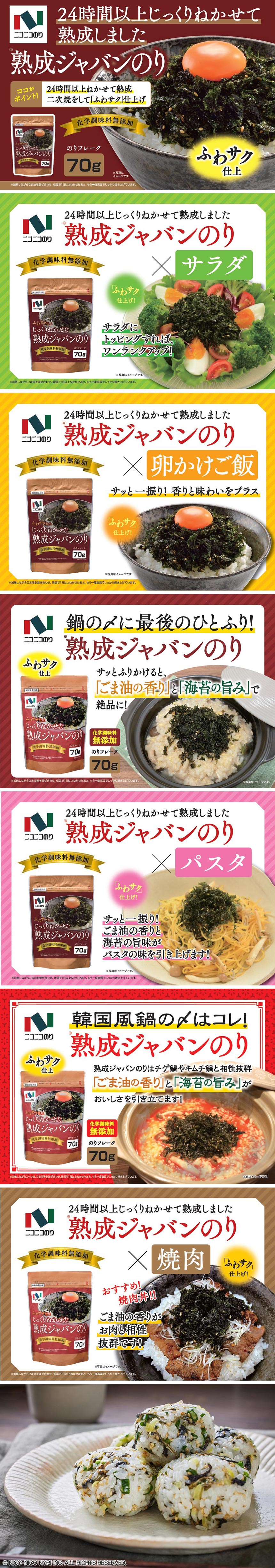 バラ干しのりと塩、コーン油、ごま油等を焙煎し、5℃以下の低温熟成室で24時間以上ねかせ、のりにごま油がなじんだ状態で高温で二次焼きを行うことで「ふわサク」感を実現しました。