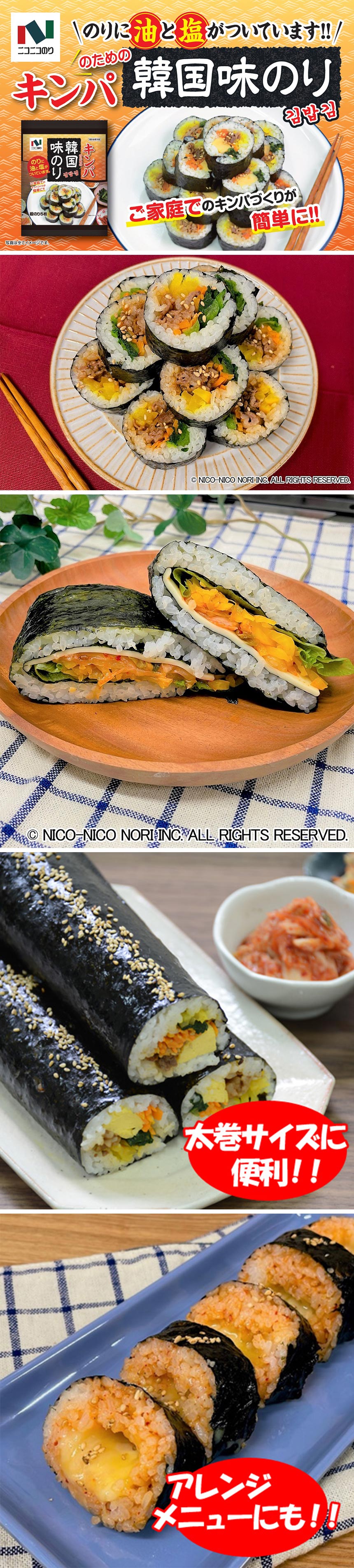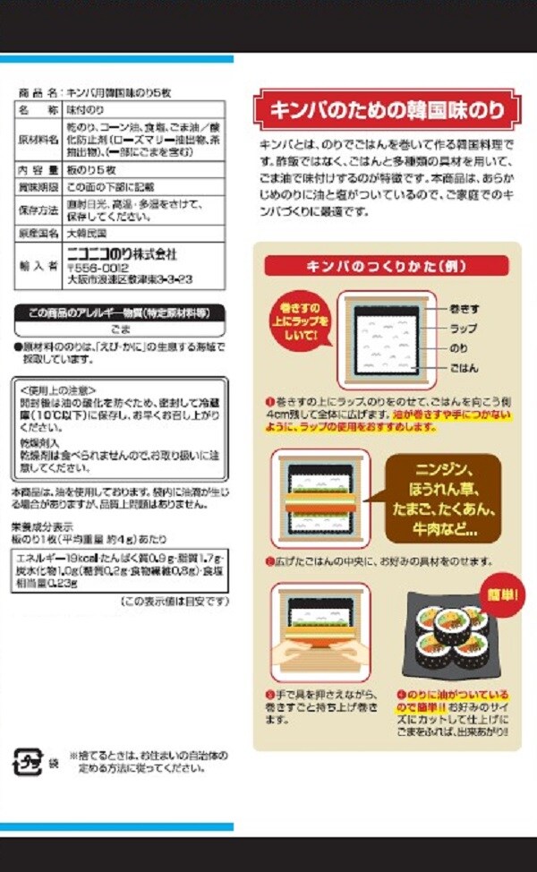 ニコニコのり「キンパ用韓国味のり5枚」は、海苔に予め油と塩がついた太巻サイズの商品ですので、味付けの調整が不要で、ご家庭でのキンパ作りに便利な商品です。