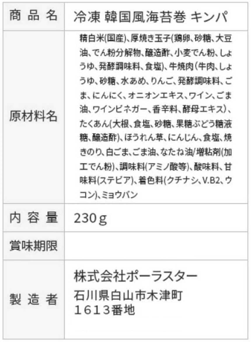 - 冷凍寿司 いしの屋韓国風海苔巻キンパ 230g(8切入)