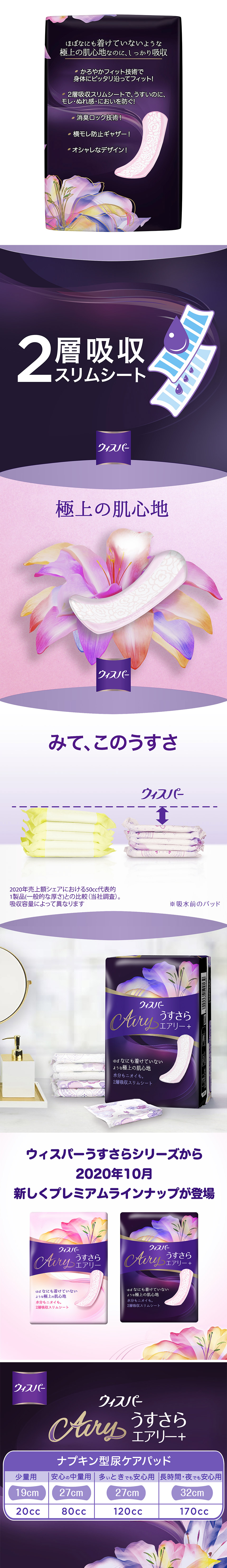 [18個]P&Gジャパン ウィスパー うすさらエアリー+ 女性用 吸水ケア 80cc 安心の中量用 ナプキン型尿ケアパッド 27cm 18枚 | ほぼなにも着けていないような極上の肌心地