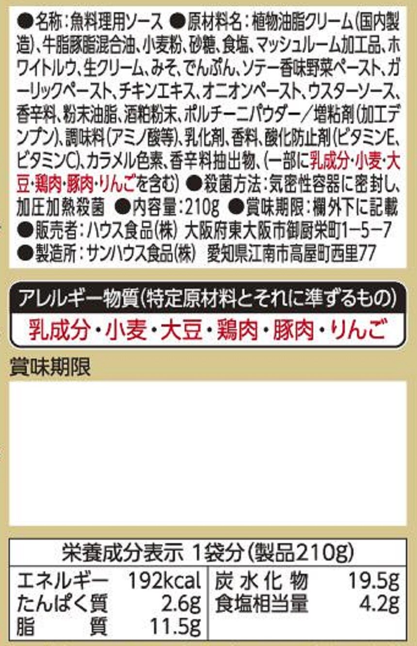 ・5種の野菜(マッシュルーム、ポルチーニ、オニオン、ガーリック、ニンジン)が溶けこんだ、濃厚きのこクリームソースです。