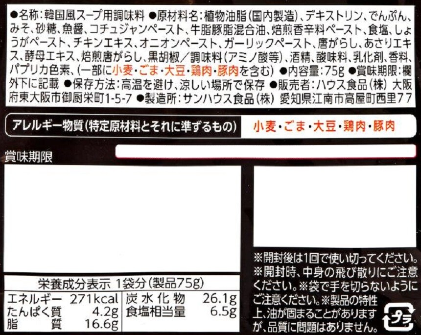 ・凄味スンドゥブチゲの素 <海鮮の旨みの辛口> 75g×6個 (賞味期限:2024/02/29)