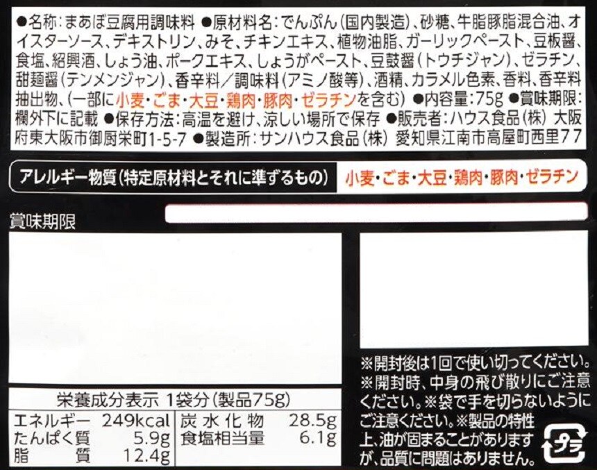 ・凄味麻婆豆腐の素 コクと旨みの広東式 75g×8個 (賞味期限:2024/02/29)