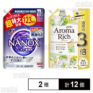 [2種計12個]ライオン トップ スーパーNANOX ニオイ専用 つめかえ 超特大 1230g / ソフラン アロマリッチ エリ― つめかえ 特大 1200ml