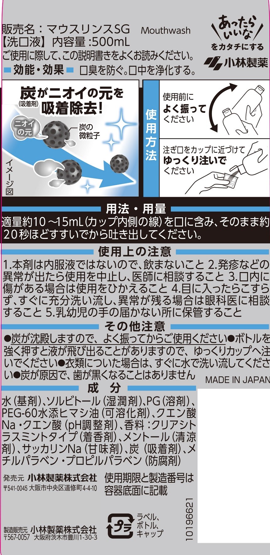 [30本]小林製薬 スミガキ マウスリンス 500mL | ●活性炭(吸着剤)配合マウスリンス ●ノンアルコール ●低刺激タイプ ●クリアシトラスミント味