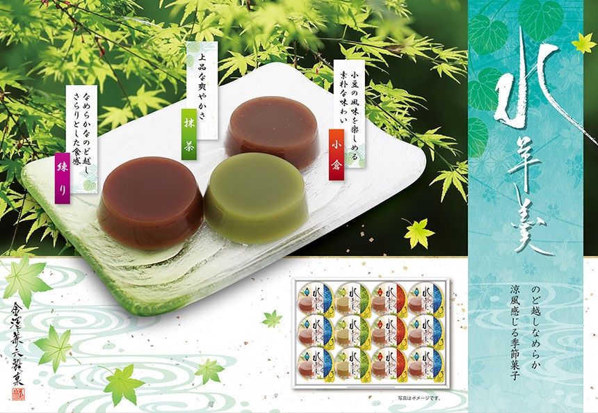 なめらかな口当たりとさらっとした喉ごしにこだわった3種の水羊羹(抹茶・練り・小倉)の詰合せです。