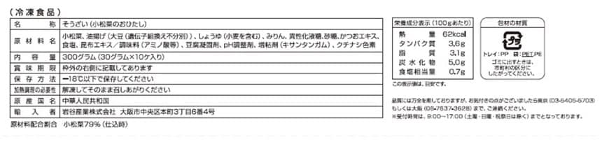 優しい味付けの小松菜のおひたしです。30g1食分ずつ小分けになっているので、必要な分だけ取り出してご使用いただけます。