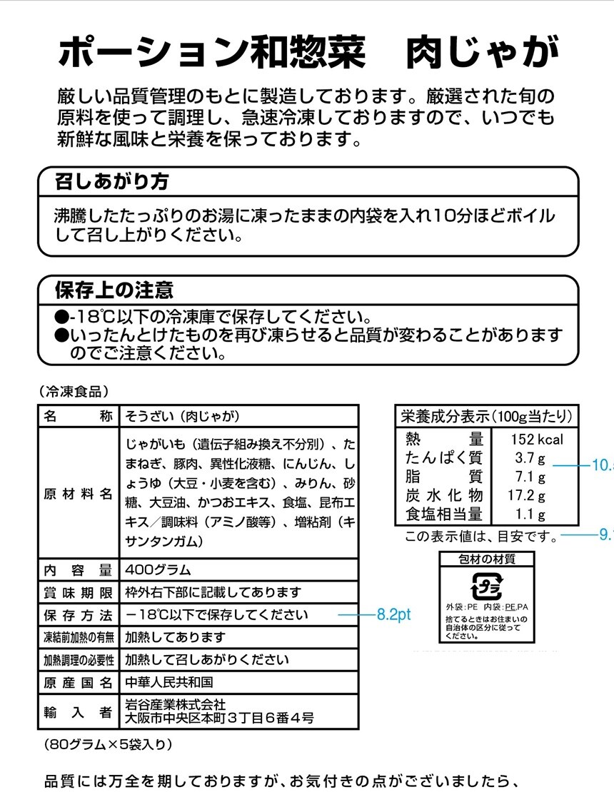 ・ポーション惣菜 肉じゃが 400g(80g×5食)×1個
