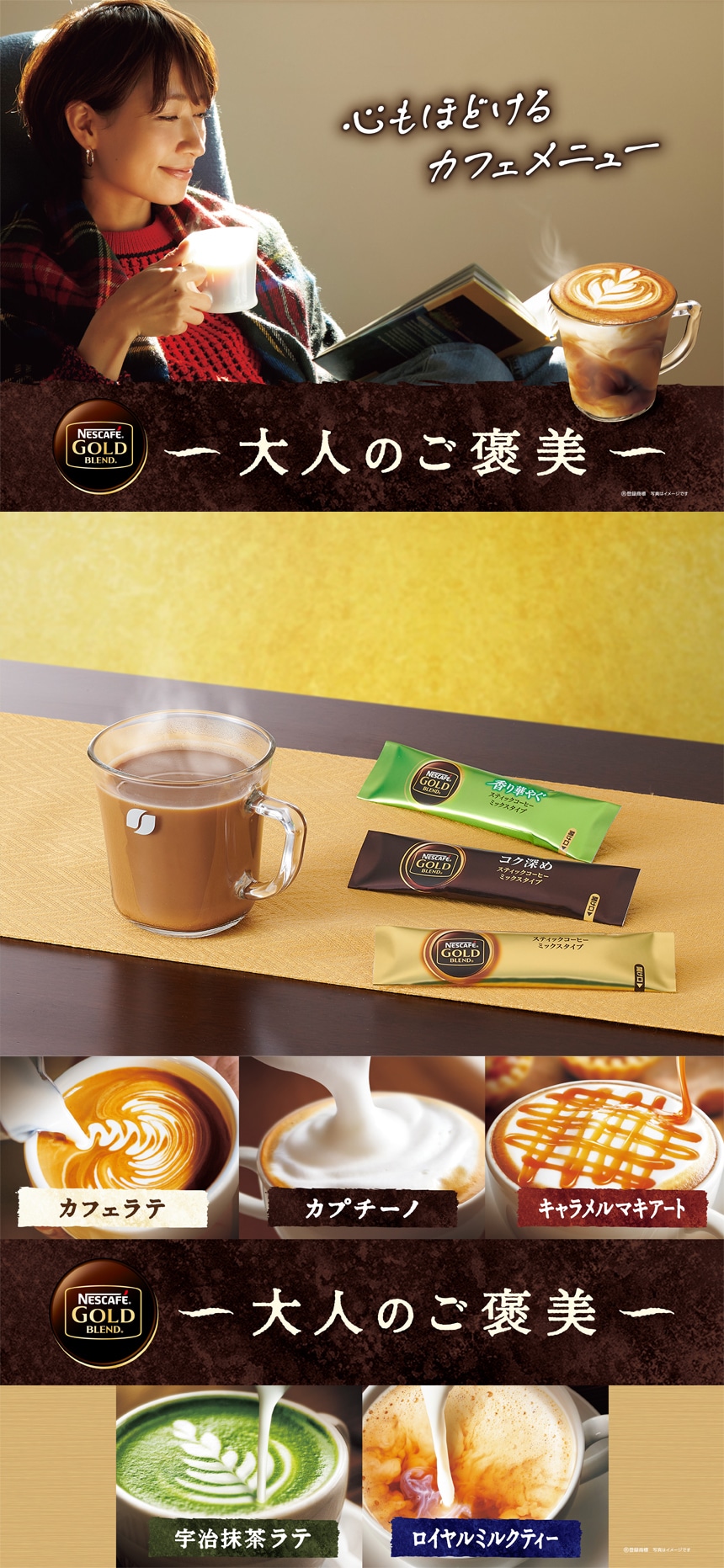 ●ミルクとコーヒーのコクを感じる濃厚な味わいが絶妙なこだわりの一杯の「ネスカフェ ゴールドブレンド 大人のご褒美 カフェラテ」