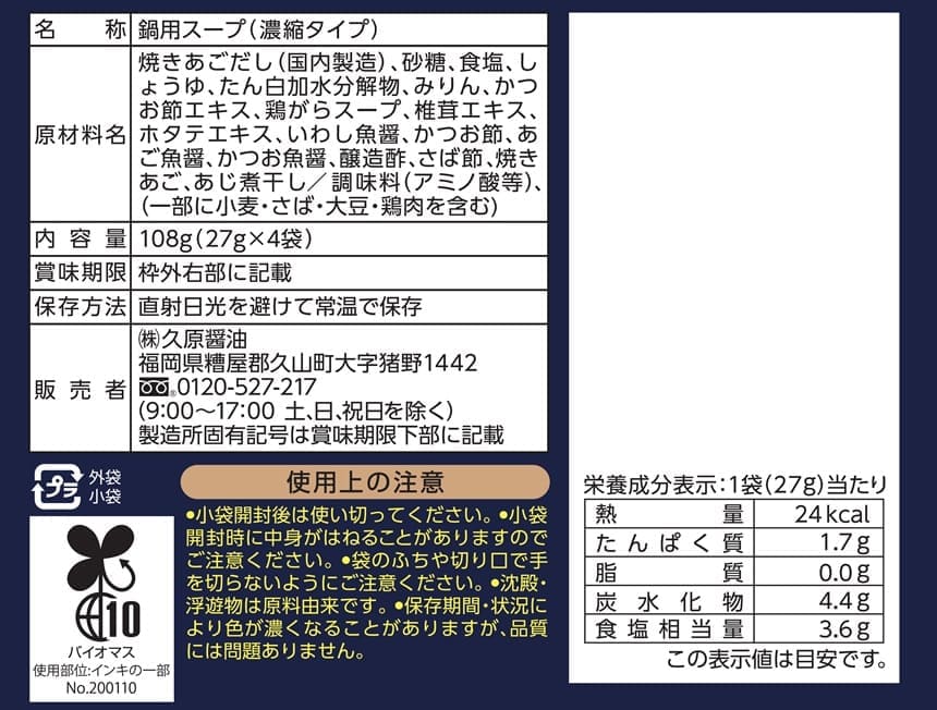 さすが、久原だなぁと思える良い味です。鍋に限らず便利に使っています。ボトルの麺つゆに比べて小分け包装は劣化しにくい所が気に入っています。
