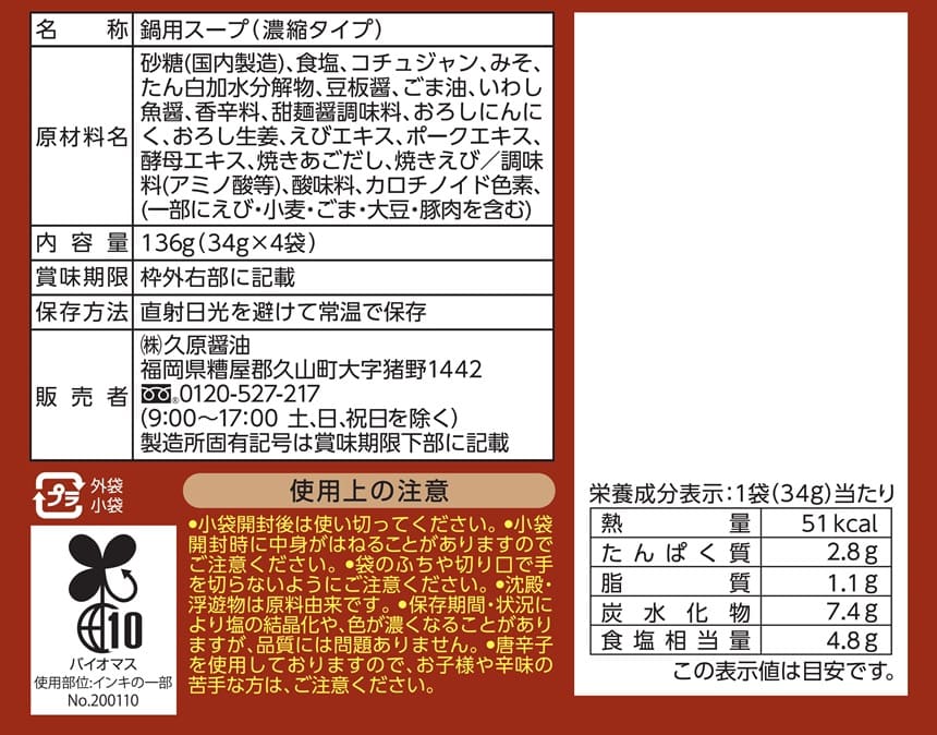 コチュジャン・豆板醤・唐辛子の辛みと米味噌のコクに、焼きあごだしやえびの旨みを合わせたやみつきになる味わいの鍋つゆです。