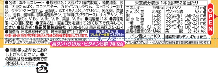1本でタンパク質が20g摂取できることに加え、クランベリーとストロベリー入りで具材の味わいや満足感が楽しめるクランチチョコタイプのプロテインバー。