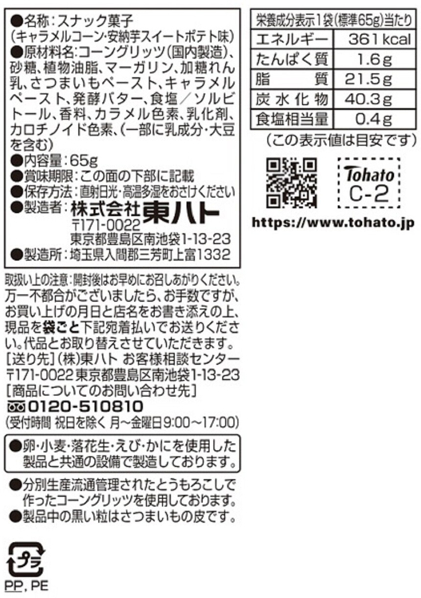 [24袋]東ハト キャラメルコーン安納芋スイートポテト味 65g | ふんわりサクサク、口の中ですうっととろけるキャラメルコーンの安納芋スイートポテト味です。