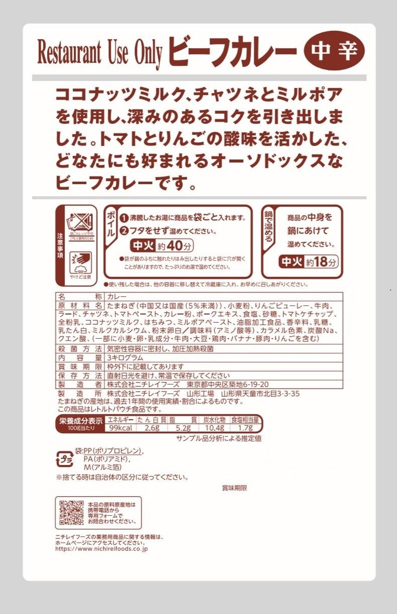 [4袋] ニチレイフーズ レストラン用 ビーフカレー(中辛) 3kg | ココナッツミルク、チャツネとミルポアを使用し、深みのあるコクを引き出しました。